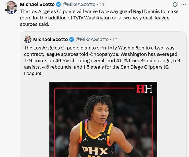 名记Michael Scotto跟进报道,快船队为了签下泰泰华盛顿,将裁掉后卫雷伊丹尼斯腾出双向名额。