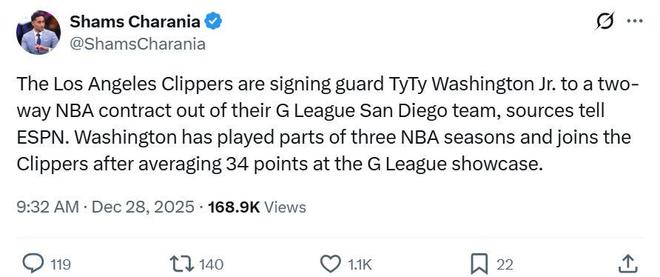根据ESPN名记Shams报道,快船队将与泰泰华盛顿签下一份双向合同。